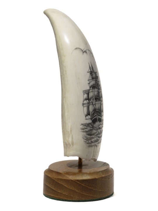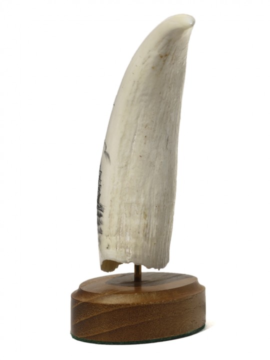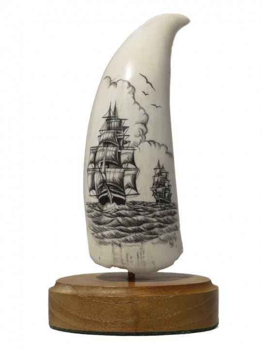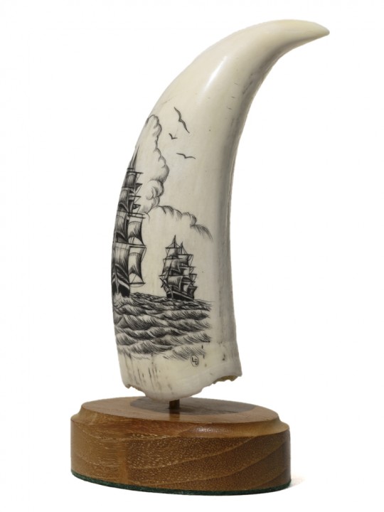 This scrimshaw is done on a sperm whale’s tooth. Federal legislation bans the interstate shipment of whale ivory. It can only be shipped intrastate (within the state). All of our whale ivory is located with our associate in the state of Florida. It can be purchased directly from our website and shipped only to an address within the state of Florida. If one has a relative, trusted friend or business associate within the state of Florida, we can ship to that specified address in order to comply with Federal legislation. The scrimshaw can then be forwarded to you and everyone complies with the law. Any questions, email us.
